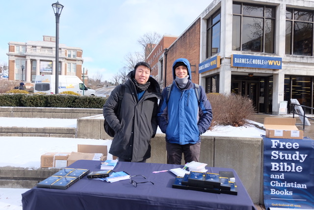 In the morning, trainees and the local saints met for coordination. We set a goal to have more conversations with students rather than to merely pass out tracts and Bibles. Then we went to West Virginia University where we tabled for three hours. Our main goal was to invite students to the dinner and Bible study that evening. Many students showed interest and signed up. One of the students whom we met the day before even stopped by the table to confirm the event for that night. The dinner and Bible study was held on campus, and some of the local saints joined. Eight students came and there were interactions between the students and the local saints. Three of the eight stayed for the Bible reading and fellowship time. We read a portion from John 1:19-51 and many, including the three new students who came, shared. The time was very sweet. Among the eight students who came, four students seemed to be promising regular students to come to future Bible studies.